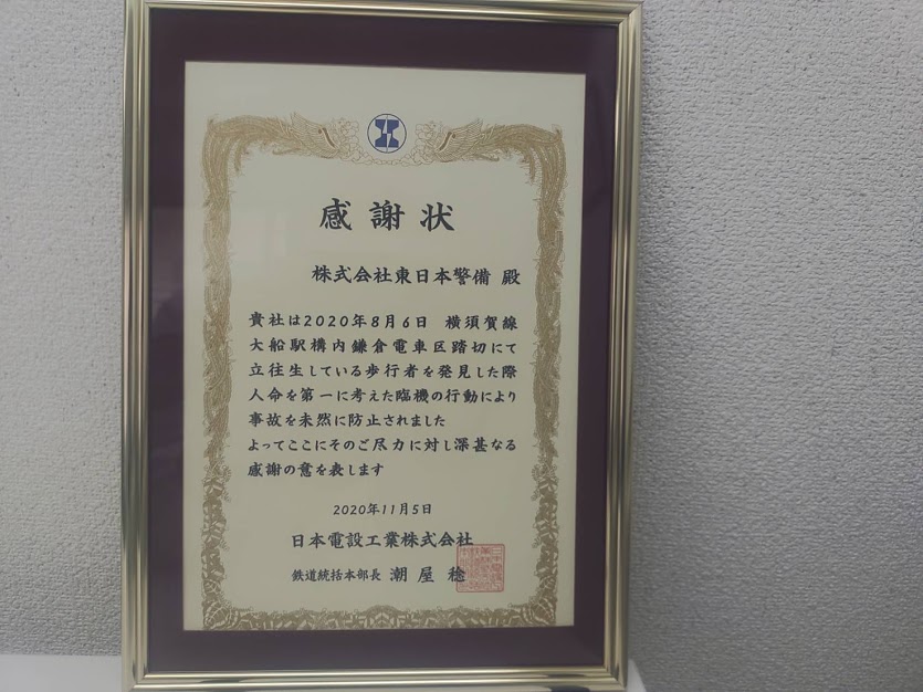 2020年11月6日 / 最終更新日時 : 2021年4月13日 higasinihonkeibi@gmail.com 実績 日本電設工業様より感謝状を頂きました日本電設工業株式会社様より感謝状を頂きました。これからも事故防止に努めます。